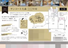 紙面中央には間取図を大きくレイアウトし、また物件外観の切り抜き写真をアイキャッチにすることで、インパクトを出しています。