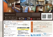 背景には物件外観写真を、紙面左側にはリフォーム完成予想図も掲載し、物件イメージを視覚的に伝える工夫をしています。