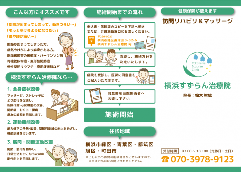 Works リーフレット(横浜すずらん治療院様) グラフィック制作 2017.01.13 横浜市緑区・青葉区・都筑区・旭区・町田市を中心に、訪問リハビリ&マッサージを行う「横浜すずらん治療院」様のリーフレット。 イラストを用いて老若男女に親しまれるような安心感のあるデザインに仕上げました。また、大きめの文字を使用して、目の悪い方にも見やすいデザインを心がけました。 リーフレット/A4×6P/巻き三つ折り 雰囲気:爽やか雰囲気:ナチュラル雰囲気:かわいい色:ブルー色:グリーンデザイン << 無料の賃貸 webサイト制作(株式会社 ルッソ様) | 一覧に戻る | ロゴ(横浜すずらん治療院様) >> 関連記事 株式会社 東神サービス様 webサイト制作 投資用区分マンション マイソク(東京都練馬区) 賃貸アパート マイソク(神奈川県横浜市鶴見区) 中古マンション マイソク(東京都江東区)