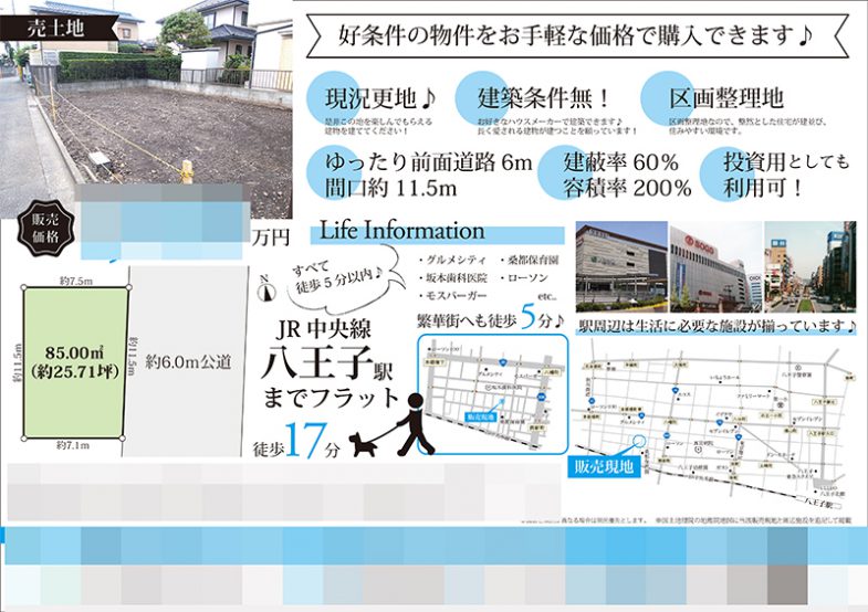 Works 土地 マイソク(東京都八王子市) 不動産図面制作 2017.11.26 特長豊かな物件ということで、メインとなるキャッチコピーのフォントにも遊び心を加え、落ち着きと個性を演出しました。 オリジナルマイソク、B4横長、片面 雰囲気:シンプル雰囲気:かわいい色:ブルー区画図地図 << 土地 マイソク(東京都世田谷区) | 一覧に戻る | 不動産買取ナビ(業者向け) webサイト制作(ファインド株式会社様) >> 関連記事 土地 マイソク(東京都豊島区) 中古一戸建 マイソク(東京都大田区) 中古マンション マイソク(東京都江戸川区) 中古マンション マイソク(東京都八王子市)