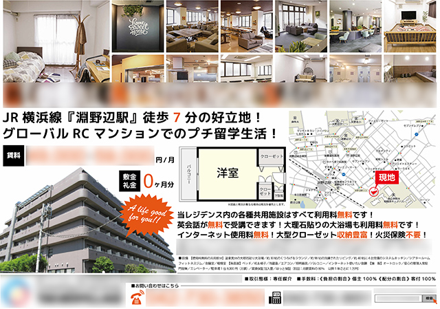 Works 賃貸マンション マイソク(神奈川県相模原市中央区) 不動産図面制作 2016.04.22 大浴場やジムなど共用部分が多くシェアハウス的な面のある賃貸物件でしたので、入居後の生活をイメージしやすいよう写真をたくさん掲載しました。 ターゲット層が10~20代ということで、オレンジをポイントにポップなイメージに仕上げています。 オリジナルマイソク、B4横長、片面 雰囲気:ポップ色:イエロー・オレンジ間取図地図 << ガールズバンドステージコンテスト様 webサイト制作 | 一覧に戻る | シロクマトランク様 webサイト制作(2018年5月リニューアル) >> 関連記事 中古マンション マイソク(東京都練馬区) 高田馬場総合法律事務所様 webサイト制作 中古一戸建 マイソク(東京都八王子市) 中古一戸建 マイソク(東京都町田市)