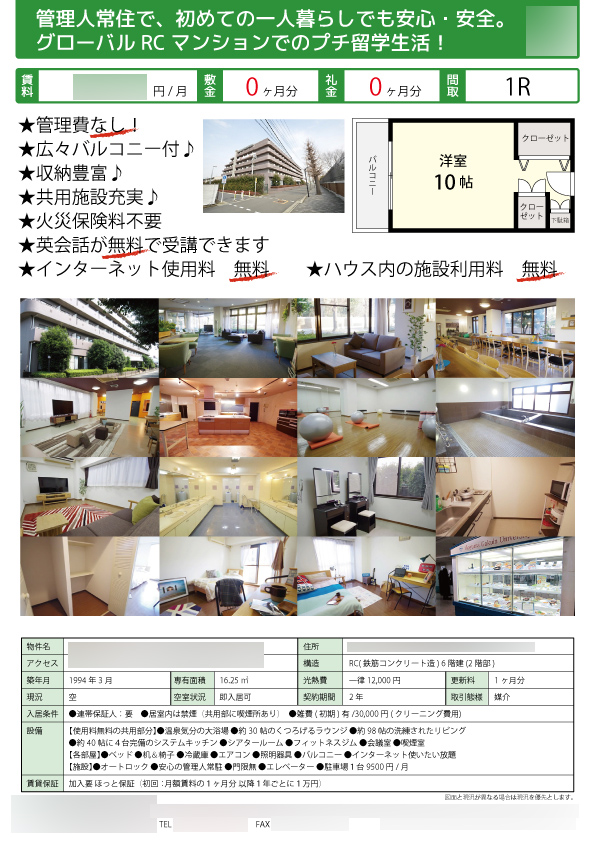 Works 賃貸マンション マイソク(神奈川県相模原市中央区) 不動産図面制作 2016.01.19 大浴場やジムなど共用部分が多くシェアハウス的な面のある賃貸物件でしたので、入居後の生活をイメージしやすいよう写真をたくさん掲載しました。 物件のメリット部分に手描き風のラインを配し、より印象に残るよう工夫しています。 オリジナルマイソク、A4縦長、片面 雰囲気:シンプル色:グリーン間取図 << いわくら不動産センター株式会社様 webサイト制作 | 一覧に戻る | 株式会社 泰興様 webサイト制作 >> 関連記事 中古マンション マイソク(東京都港区) 土地 マイソク(東京都杉並区) 土地 マイソク(東京都目黒区) 中古マンション マイソク(京都府京都市下京区)