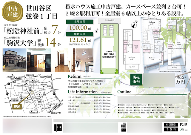 Works 中古一戸建 マイソク(東京都世田谷区) 不動産図面制作 2017.10.16 グリーンを基調に、爽やかな印象のデザインに仕上げました。 敷地の広さを強調するよう、配置図に車のイラストを掲載しています。 オリジナルマイソク、B4横長、片面 雰囲気:爽やか雰囲気:ナチュラル色:グリーン色:ゴールド間取図地図配置図 << ロゴ(株式会社プラスワン様) | 一覧に戻る | 賃貸アパート マイソク(東京都日野市) >> 関連記事 中古一戸建 マイソク(東京都八王子市) 中古一戸建 マイソク(神奈川県横浜市磯子区) 中古一戸建 マイソク(東京都中野区) 新築賃貸アパート マイソク(神奈川県川崎市多摩区)
