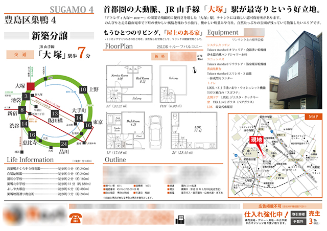 Works 新築一戸建(建売1棟) マイソク(東京都豊島区) 不動産図面制作 2017.02.23 情報量の多い紙面を読みやすく整えました。 色数を抑え、落ち着きと安心感を演出しています。 オリジナルマイソク、B4横長、片面 雰囲気:シンプル色:イエロー・オレンジ間取図地図路線案内図 << 投資用1棟マンション マイソク(東京都練馬区) | 一覧に戻る | 土地 マイソク(東京都大田区) >> 関連記事 土地 マイソク(東京都豊島区) 中古一戸建 マイソク(東京都八王子市) 中古マンション マイソク(埼玉県草加市) 土地 マイソク(東京都目黒区)