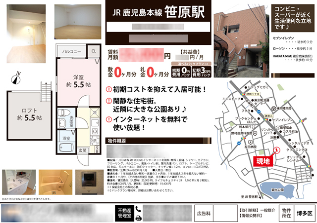 Works 賃貸アパート マイソク(福岡県福岡市博多区) 不動産図面制作 2014.08.20 情報量の多い紙面を読みやすく整えました。 色数を抑え、落ち着きと安心感を演出しています。 オリジナルマイソク、B4横長、片面 雰囲気:シンプル色:ブラック間取図地図 << センチュリー21アイワハウス株式会社様 webサイト制作 | 一覧に戻る | 株式会社 東海 建築部様 webサイト制作 >> 関連記事 中古一戸建 マイソク(東京都杉並区) THE TOKYO TOWERS MID TOWER webサイト制作(株式会社 ラピス様) 中古マンション マイソク(東京都渋谷区) 土地 マイソク(東京都目黒区)