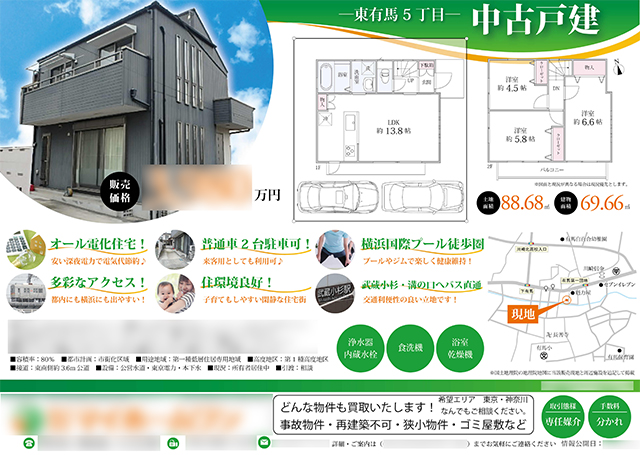 Works 中古一戸建 マイソク(神奈川県川崎市宮前区) 不動産図面制作 2018.01.18 サークルや曲線を活かして印象に残るデザインに仕上げました。 オリジナルマイソク、B4横長、片面 雰囲気:ポップ色:イエロー・オレンジ色:グリーン間取図地図 << 中古マンション マイソク(神奈川県相模原市緑区) | 一覧に戻る | チラシ(センチュリー21 ホームライフ株式会社様) >> 関連記事 中古マンション マイソク(東京都台東区) 榊原動物病院様 Webサイト制作 中古マンション マイソク(東京都港区) 新築一戸建(建売2棟) マイソク(神奈川県横浜市保土ヶ谷区)