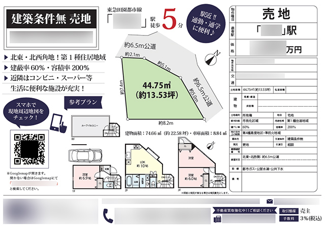 Works 土地 マイソク(神奈川県横浜市青葉区) 不動産図面制作 2018.03.20 地図の代わりにGoogleマップのQRコードを掲載することでコストを軽減しています。 地図のエリアを縮小することにもなり、その分、物件情報に紙面を割くことが可能になりました。 スマホでGoogleマップを参照いただくことで、お客様にとっての利便性向上にもつながります。 テンプレートマイソク、B4横長、片面 雰囲気:シンプル色:ホワイト間取図区画図 << ガールズバンドステージコンテスト様 webサイト制作 | 一覧に戻る | 新築一戸建(建売5棟) マイソク(東京都練馬区) >> 関連記事 投資用1棟アパート マイソク(神奈川県横浜市保土ヶ谷区) 土地 マイソク(東京都豊島区) アビティ宮前平 webサイト制作(株式会社 マイホームワン様) 土地 マイソク(東京都八王子市)