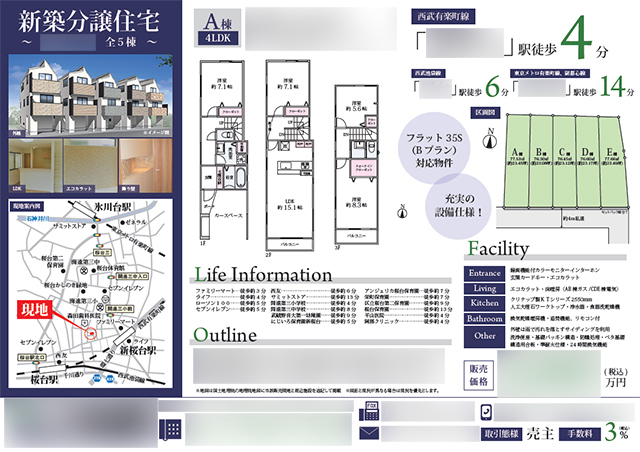 Works 新築一戸建(建売5棟) マイソク(東京都練馬区) 不動産図面制作 2018.05.07 コーポレートカラーを使用し、落ち着きのある色調とまとまりのあるレイアウトで信頼感や高級感を演出しました。 5棟物件ですが、1棟ごとに1枚のマイソクとしてご依頼いただき、デザインは5棟共通で制作させていただきました。 オリジナルマイソク、B4横長、片面 雰囲気:高級感・シック色:ブルー色:グリーン間取図区画図地図 << 土地 マイソク(神奈川県横浜市青葉区) | 一覧に戻る | 賃貸アパート マイソク(神奈川県横浜市西区) >> 関連記事 中古マンション マイソク(神奈川県座間市) 中古一戸建 マイソク(東京都八王子市) 土地 マイソク(神奈川県横浜市保土ヶ谷区) 中古マンション マイソク(東京都千代田区)