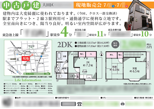 Works 中古一戸建 チラシ(東京都大田区) グラフィック制作 2018.06.29 マイソク(販売図面)としてもチラシとしてもご利用いただける形でデザイン致しました。 紙面右上の「現地販売会」の情報を消すことでマイソクとしてご利用いただけるようになっています。 明るく親しみやすいカラーリングとまとまりのあるレイアウトに仕上げています。 チラシ兼オリジナルマイソク、B4横長、片面 雰囲気:シンプル色:グリーン間取図地図チラシ制作 << 新築一戸建(建売3棟) マイソク(埼玉県新座市) | 一覧に戻る | 新築一戸建(建売1棟) マイソク(神奈川県川崎市宮前区) >> 関連記事 土地 マイソク(東京都八王子市) 土地 マイソク(東京都港区) 中古マンション マイソク(千葉県東金市) 株式会社 ラインコーポレーション(売買)様 webサイト制作