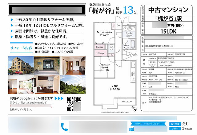 Works 中古マンション マイソク(神奈川県川崎市高津区) 不動産図面制作 2018.09.15 テンプレートマイソクも、間取図のデザインで高級感を演出することができます。 地図の代わりに現地のGoogle mapへのリンクとなるQRコードを掲載することも可能です。 テンプレートマイソク、B4横長、片面 雰囲気:シンプル色:ブルー間取図 << 土地 マイソク(東京都八王子市) | 一覧に戻る | 中古一戸建 マイソク(神奈川県藤沢市) >> 関連記事 株式会社 Mackie-i-Lands様 webサイト制作 土地 マイソク(神奈川県横浜市青葉区) 投資用シェアハウス マイソク(神奈川県川崎市多摩区) 投資用区分マンション マイソク(神奈川県川崎市川崎区)