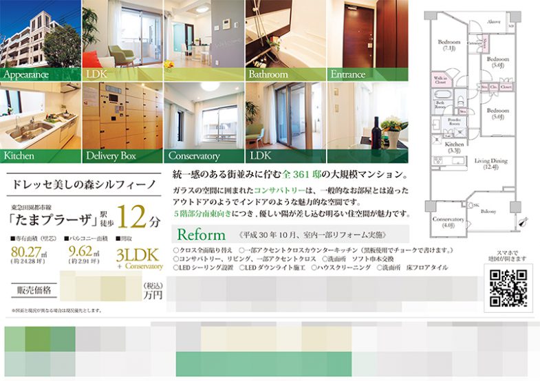 Works 中古マンション マイソク(神奈川県川崎市宮前区) 不動産図面制作 2019.01.10 グリーンとゴールドで爽やかかつ高級感のある印象に仕上げました。 タイル状に並べた写真に様々なグリーンの帯を載せ、変化をつけつつクライアント様のロゴデザインとリンクするような工夫を加えています。 さらに、間取図を英語で作成することで、高級感を高めています。 オリジナルマイソク、B4横長、片面 雰囲気:高級感・シック雰囲気:爽やか色:グリーン色:ゴールド間取図地図QRコード << 中古マンション マイソク(神奈川県横浜市都筑区) | 一覧に戻る | 中古マンション マイソク(東京都中野区) >> 関連記事 投資用シェアハウス マイソク(神奈川県川崎市多摩区) 土地 マイソク(神奈川県川崎市中原区) 中古マンション マイソク(神奈川県横浜市青葉区) 中古一戸建 マイソク(東京都町田市)