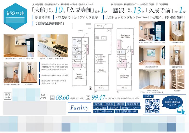 Works 新築一戸建(建売1棟) マイソク(神奈川県鎌倉市) 不動産図面制作 2019.02.22 間取図の周りに写真を配置し、写真の下にはキャッチコピーを入れることで、物件のアピールポイントがわかりやすいよう工夫しました。 地図はQRコードにすることで、地図のスペースを縮小し、その分写真を多く掲載しています。 色はコーポレートカラーにあわせて青を使用しています。 間取図も弊社にて作成させていただきました。 オリジナルマイソク、B4横長、片面 マイソク雰囲気:爽やか色:ブルー間取図地図QRコード << 中古マンション マイソク(神奈川県川崎市中原区) | 一覧に戻る | 中古マンション マイソク(東京都大田区) >> 関連記事 中古マンション マイソク(埼玉県狭山市) チラシ(ガールズバンドステージコンテスト様) 中古マンション マイソク(東京都台東区) 土地 マイソク(東京都新宿区)