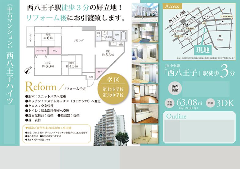 リフォームが売りの物件なので、リフォーム内容を真ん中に配置することで目を引くようにしました。