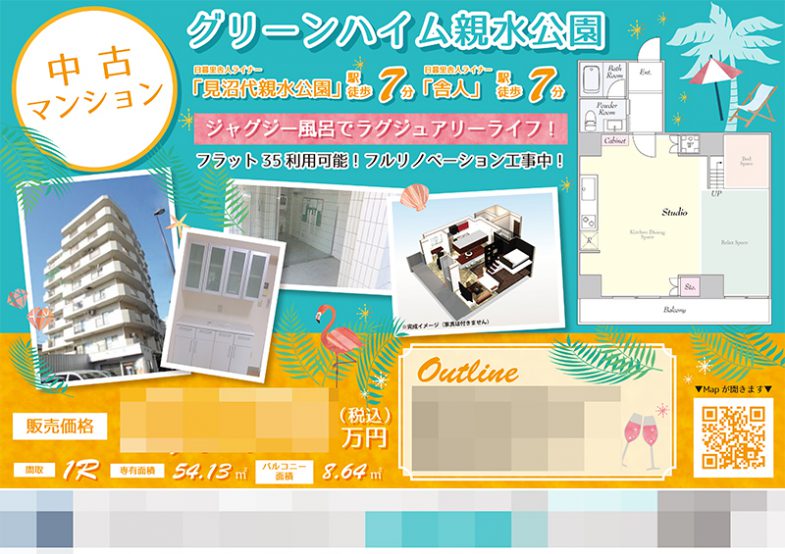 Works 中古マンション マイソク(東京都足立区) 不動産図面制作 2019.07.31 クライアントの要望により、オレンジと緑を使い、所々にフラミンゴやヤシの木をあしらったバリ風のデザインに。 写真やイメージ図を複数枚使うことで、物件の様子がよくわかるようにしました。 地図はスペース削減のためにQRコードを使用しています。間取図も弊社にて作成させていただきました。 オリジナルマイソク、B4横長、片面 マイソク雰囲気:かわいい雰囲気:ポップ色:イエロー・オレンジ色:グリーン間取図地図QRコード << 土地 マイソク(神奈川県鎌倉市) | 一覧に戻る | 中古マンション マイソク(東京都八王子市) >> 関連記事 売りビル マイソク(東京都大田区) 中古一戸建 マイソク(大阪府交野市) 投資用区分マンション マイソク(東京都品川区) 中古マンション マイソク(埼玉県越谷市)