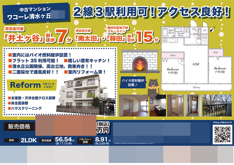 地図はQRコードにすることでスペースを削減し、その分を間取図、キャッチコピーなどのスペースにあてています。