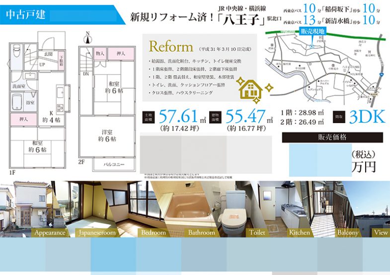 Works 中古一戸建 マイソク(東京都八王子市) 不動産図面制作 2019.02.28 写真が複数枚あったため、目を引くようマイソクの下部に斜めにトリミングして配置しました。 リフォーム済の物件のため、リフォーム内容を真ん中に配置して目立たせています。また、空いたスペースにリフォームのアイコンを入れることで、より印象を強めました。 間取図、地図も弊社にて作成させていただきました。 オリジナルマイソク、B4横長、片面 雰囲気:高級感・シック色:ブルー色:ゴールド間取図地図 << 中古マンション マイソク(東京都八王子市) | 一覧に戻る | 賃貸マンション マイソク(東京都世田谷区) >> 関連記事 土地 マイソク(東京都千代田区) 新築マンション マイソク(東京都品川区) 新築一戸建(建売1棟) マイソク(神奈川県横浜市鶴見区) 土地 マイソク(東京都中央区)
