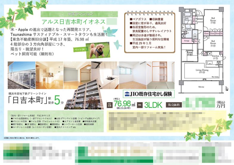 Works 中古マンション マイソク(神奈川県横浜市港北区) 不動産図面制作 2020.12.22 明るいグリーンやアクアブルーを基調に、蔦のイラストを配置し自然環境に恵まれた健康的な印象を演出しています。 ペット可マンションのイメージを強調するため、散歩中の犬の写真を掲載しました。 間取図も弊社にて作成させていただきました。 オリジナルマイソク、B4横長、片面 マイソク雰囲気:ナチュラル雰囲気:かわいい色:イエロー・オレンジ色:ブルー色:グリーン間取図 << テラスハウス マイソク(埼玉県志木市) | 一覧に戻る | アビティ宮前平 webサイト制作(株式会社 マイホームワン様) >> 関連記事 土地 マイソク(東京都千代田区) 中古一戸建 マイソク(東京都町田市) 土地 チラシ(東京都板橋区) 新築賃貸マンション(東京都江東区)
