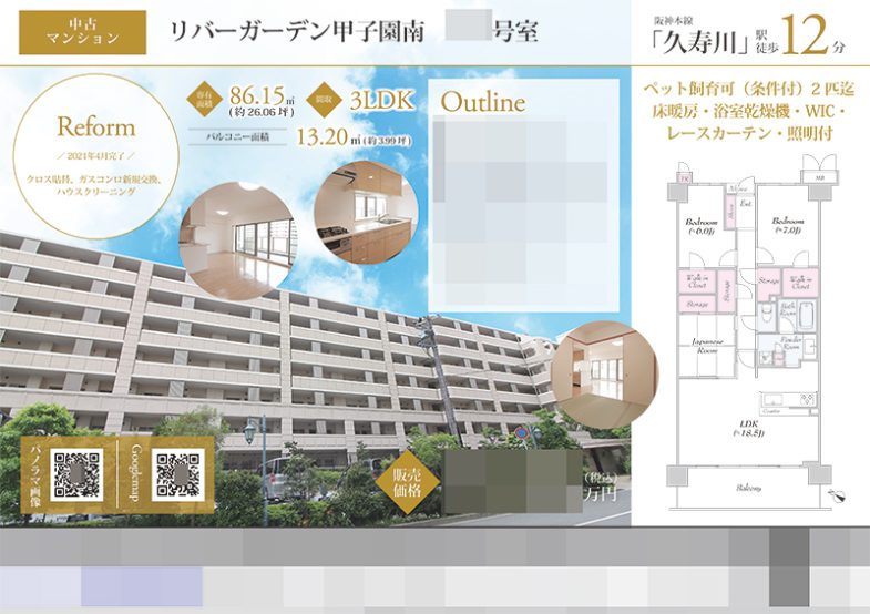 Works 中古マンション マイソク(兵庫県西宮市) 不動産図面制作 2021.09.25 物件の外観を大きく表示してインパクトのあるデザインにしました。 色は金色を使い、高級感のある印象に仕上げました。 間取図も弊社にて作成させていただきました。 地図はスペース削減のためにQRコードを使用しています。 物件のパノラマ画像もQRコードで見られるようになっています。 オリジナルマイソク、B4横長、片面 マイソク雰囲気:高級感・シック色:ゴールド間取図地図QRコード << 新築一戸建(建売1棟) マイソク(神奈川県横浜市南区) | 一覧に戻る | 中古マンション マイソク(兵庫県神戸市) >> 関連記事 土地 マイソク(東京都文京区) 中古マンション マイソク(神奈川県藤沢市) 中古マンション マイソク(神奈川県横浜市都筑区) 投資用1棟アパート マイソク(東京都大田区)