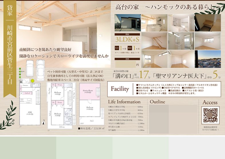 Works 貸家 マイソク(神奈川県川崎市宮前区) 不動産図面制作 2021.05.18 物件のイメージにあわせて、木目を背景に使ったナチュラルなデザインにしました。 写真を多く使用することで、物件のイメージがしやすいよう工夫しています。 地図はQRコードで掲載することで、スマホですぐに物件周辺のGooglemapが見られるようにしました。 間取図も弊社で作成させていただきました。 オリジナルマイソク、B4横長、片面 マイソク雰囲気:ナチュラル色:ブラウン・ベージュ色:ゴールド間取図地図QRコード << 土地 マイソク(神奈川県川崎市多摩区) | 一覧に戻る | 中古一戸建 マイソク(東京都八王子市) >> 関連記事 投資用区分マンション マイソク(東京都文京区) 中古マンション マイソク(東京都港区) 中古一戸建 マイソク(埼玉県桶川市) 中古マンション マイソク(東京都足立区)