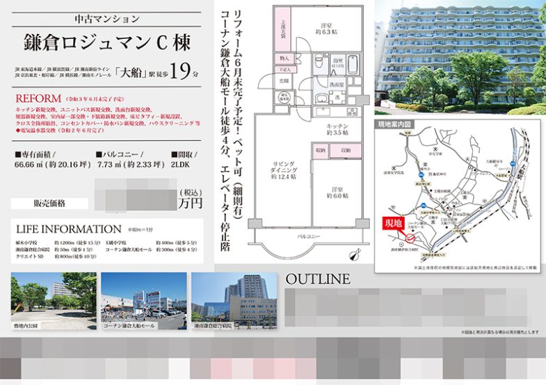 Works 中古マンション マイソク(神奈川県鎌倉市) 不動産図面制作 2021.05.24 グレーを基調としたシンプルなデザイン。 売りであるリフォームに目がいくように、赤い文字にして目立たせました。 近隣施設は文字だけでなく写真付で紹介することで、利便性の良さをイメージしていただきやすいように工夫しています。 間取図と地図も弊社で作成させていただきました。 オリジナルマイソク、B4横長、片面 マイソク雰囲気:シンプル色:シルバー・グレー間取図地図 << 土地 マイソク(東京都八王子市) | 一覧に戻る | 新築一戸建(建売1棟) マイソク(神奈川県横浜市泉区) >> 関連記事 新築一戸建(建売1棟) マイソク(東京都豊島区) ロゴ(株式会社 丸正企業不動産様) 土地 マイソク(埼玉県坂戸市) 新築一戸建(建売1棟) マイソク(東京都豊島区)