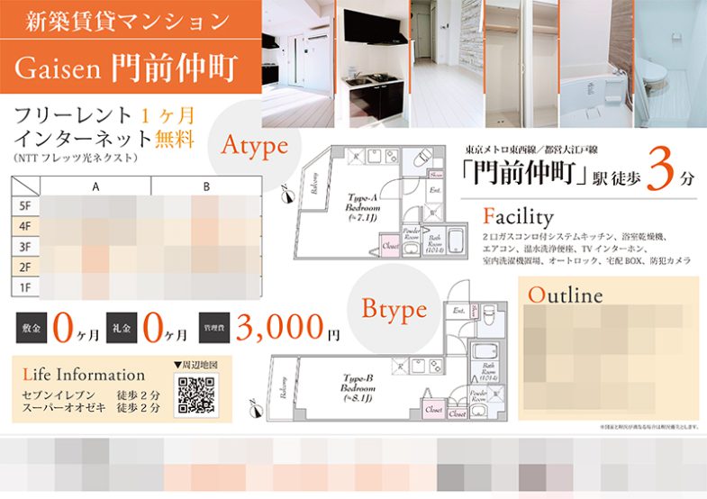 賃料は表の形で掲載し、複数の部屋を1枚のマイソクで紹介できるように工夫しました。