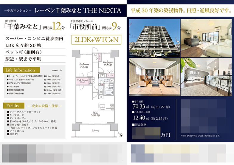 Works 中古マンション マイソク(千葉県千葉市中央区) 不動産図面制作 2021.10.22 紺色と金色を使った高級感のあるデザイン。 見る人の印象に残るように、左右にブロックを分けています。 ライフインフォメーションや設備を記載することで、利便性の良い物件であることをアピールしました。 右上には写真を4枚掲載し、物件のイメージをしていただきやすいようにしました。 間取図も弊社で作成させていただきました。 オリジナルマイソク、B4横長、片面 マイソク雰囲気:高級感・シック色:ブルー色:ゴールド間取図 << Blu-rayジャケット(ガールズバンドステージコンテスト様) | 一覧に戻る | 中古マンション マイソク(東京都中央区) >> 関連記事 投資用シェアハウス マイソク(神奈川県川崎市多摩区) 中古マンション マイソク(東京都板橋区) 土地 マイソク(東京都八王子市) 土地 マイソク(神奈川県横浜市中区)