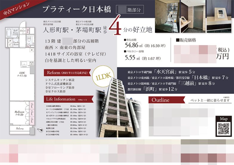 Works 中古マンション マイソク(東京都中央区) 不動産図面制作 2021.10.23 紺色をベースとした高級感のあるデザイン。 アクセスを大きく記載することで、立地の良い物件であることを印象付けています。 中央に外観写真を配置することで、さらにインパクトを出しました。 地図はQRコードにすることで、スマホで簡単に現地周辺地図が見られるようにしました。 間取図も弊社で作成させていただきました。 オリジナルマイソク、B4横長、片面 マイソク雰囲気:高級感・シック色:ブルー間取図地図QRコード << 中古マンション マイソク(千葉県千葉市中央区) | 一覧に戻る | 中古マンション マイソク(東京都中央区) >> 関連記事 富士火災代理店 webサイト制作(株式会社 マイホームワン様) 土地 マイソク(東京都世田谷区) 土地 マイソク(神奈川県横浜市青葉区) 中古マンション マイソク(千葉県船橋市)