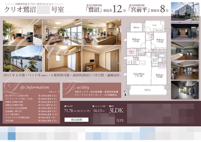 Works 中古マンション マイソク(神奈川県川崎市宮前区) 不動産図面制作 2021.11.09 くすんだピンクを使った女性顧客を狙ったデザイン。 写真を多く使用することで、物件のイメージを膨らませやすいようにしました。 英語と明朝体のフォントを効果的に使い、高級感があり、上品な印象を演出。 間取図は壁をグレーにして洗練された印象に。 ライフインフォメーションを記載することで、立地の良さをアピールしました。 オリジナルマイソク、B4横長、片面 マイソク雰囲気:かわいい色:ピンク・パープル間取図 << 中古マンション チラシ(東京都立川市) | 一覧に戻る | 新築賃貸アパート マイソク(東京都西東京市) >> 関連記事 賃貸マンション マイソク(東京都目黒区) 中古マンション マイソク(宮崎県宮崎市) 投資用区分マンション マイソク(神奈川県川崎市川崎区) 土地 マイソク(東京都品川区)
