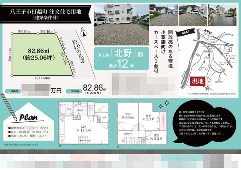 Works 土地 マイソク(東京都八王子市) 不動産図面制作 2021.11.10 コーポレートカラーを使ったシンプルでモダンなデザイン。 土地のマイソクであることがわかりやすいように、マイソクの上部と下部で記載内容を明確に分け、上部には土地のことを記載し、下部には参考プランを記載しました。 間取図、区画図、地図も弊社で作成させていただきました。 オリジナルマイソク、B4横長、片面 マイソク雰囲気:かわいい色:グリーン間取図区画図地図 << 不動産売却物件募集チラシ | 一覧に戻る | 土地 マイソク(東京都八王子市) >> 関連記事 貸事務所 マイソク(東京都千代田区) 中古マンション マイソク(神奈川県藤沢市) 中古一戸建 マイソク(神奈川県川崎市高津区) 土地 マイソク(東京都台東区)