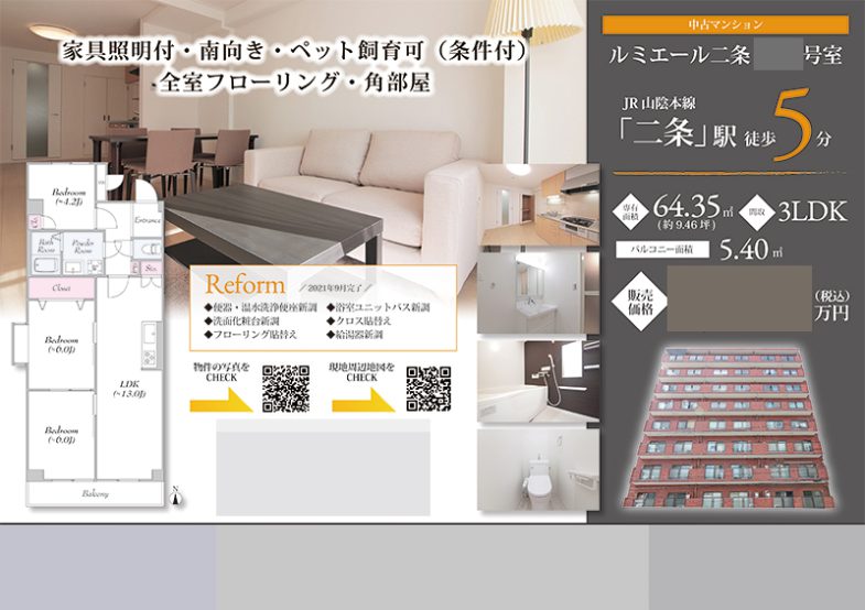 Works 中古マンション マイソク(京都府京都市中京区) 不動産図面制作 2021.10.28 グレーとオレンジを基調とし、背景に室内写真を大きく使ったインパクトのあるデザイン。 リフォーム内容や室内写真を掲載することで、リフォーム済のキレイな物件であることを印象付けました。 地図はQRコードにすることで、スマホですぐにGooglemapを確認できるようにしました。 間取図も弊社で作成させていただきました。 オリジナルマイソク、B4横長、片面 マイソク雰囲気:高級感・シック色:イエロー・オレンジ色:シルバー・グレー間取図地図QRコード << 投資用1棟マンション マイソク(東京都八王子市) | 一覧に戻る | 土地 マイソク(東京都東久留米市) >> 関連記事 中古マンション マイソク(東京都府中市) 土地 マイソク(東京都千代田区) 新築一戸建(建売2棟) マイソク(東京都東久留米市) 土地 マイソク(東京都八王子市)