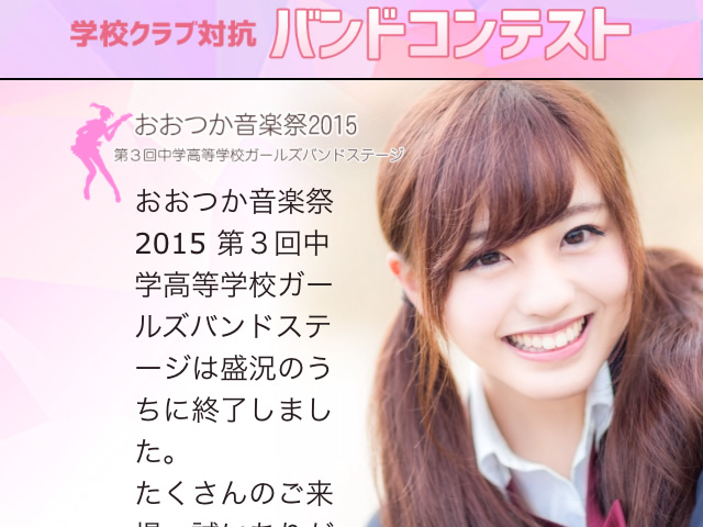 Youtube「おおつか音楽祭2015 第3回中学高等学校ガールズバンドステージ」チャンネルの各バンドの演奏動画にリンクし、コンテストの様子を閲覧できるようにしています。