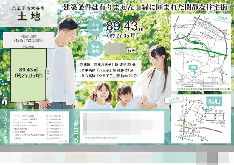 Works 土地 マイソク(東京都八王子市) 不動産図面制作 2022.01.08 写真を背景に使ったインパクトがあり、爽やかなデザイン。 土地のマイソクですが、土地を購入した後のイメージをしていただけるように家族のイメージ写真を使用しました。 区画図、地図も弊社で作成させていただきました。 地図は通常は一つのみですが、今回はさらにわかりやすくなるように「広域図」と「拡大図」の両方を作成して入れました。 オリジナルマイソク、B4横長、片面 マイソク雰囲気:爽やか雰囲気:ナチュラル色:グリーン色:ホワイト区画図地図 << 中古マンション マイソク(神奈川県鎌倉市) | 一覧に戻る | 中古一戸建 マイソク(神奈川県川崎市宮前区) >> 関連記事 株式会社 エムエス企画様 webサイト制作 中古マンション マイソク(神奈川県相模原市中央区) 株式会社 ヴァンダライズ様 webサイト制作 ペルシャ絨毯の光和様 webサイト制作