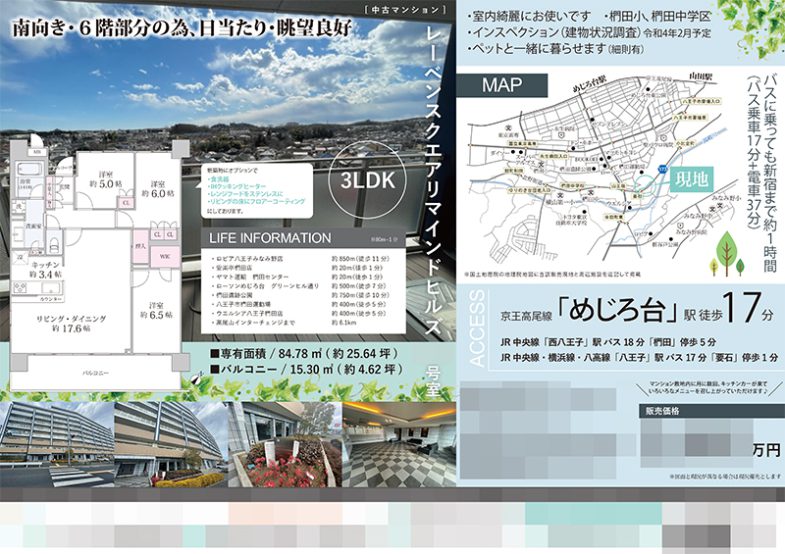Works 中古マンション マイソク(東京都八王子市) 不動産図面制作 2022.02.05 水色を基調とした爽やかなデザイン。 左側には眺望の写真を大きく配置し、眺望の良さを印象付けました。 地図と間取図も弊社で作成させていただきました。 より洗練された印象になるよう、間取図の壁はグレーにしました。 利便性の良さをアピールするため、間取図の横にはライフインフォメーションを記載しました。 オリジナルマイソク、B4横長、片面 マイソク雰囲気:爽やか雰囲気:ナチュラル色:ブルー間取図地図 << 中古マンション マイソク(東京都練馬区) | 一覧に戻る | 土地 マイソク(神奈川県川崎市中原区) >> 関連記事 新築一戸建(建売1棟) マイソク(神奈川県川崎市宮前区) 中古一戸建 チラシ(東京都大田区) 新築一戸建(建売1棟) マイソク(東京都板橋区) 投資用1棟アパート マイソク(東京都八王子市)