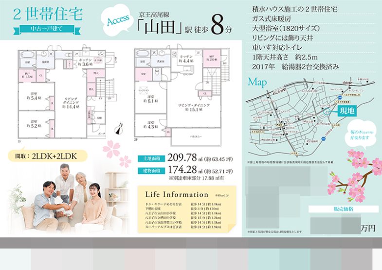 Works 中古一戸建 マイソク(東京都八王子市) 不動産図面制作 2022.03.21 中古一戸建(二世帯住宅)のマイソク。 桜がある物件のため、桜のイラストを入れて売りの一つにしました。 家族のイメージ写真を入れて、入居後のイメージがしやすいように工夫しました。 地図と間取図も弊社で作成させていただきました。 オリジナルマイソク、B4横長、片面 マイソク雰囲気:かわいい色:グリーン間取図地図 << 中古マンション マイソク(神奈川県横浜市戸塚区) | 一覧に戻る | 中古マンション チラシ(東京都渋谷区) >> 関連記事 中古マンション マイソク(神奈川県横浜市港北区) 中古マンション マイソク(東京都江戸川区) 中古一戸建 マイソク(東京都八王子市) 土地 マイソク(東京都杉並区)