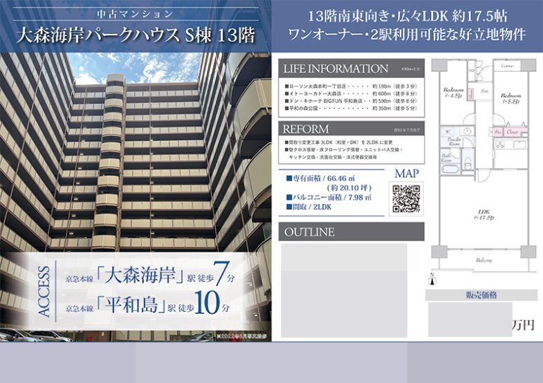 Works 中古マンション マイソク(東京都大田区) 不動産図面制作 2022.03.02 左側に大きく外観写真を配置したインパクトのあるデザイン。右側には間取図や物件概要を見やすく配置しました。(1枚目) 写真を複数枚使用して、物件のイメージがしやすいように工夫しました。(2枚目) 地図はQRコードにすることで、スマホですぐに現地周辺地図を確認できるようにしました。 間取図も弊社で作成させていただきました。 オリジナルマイソク、B4横長、片面 マイソク雰囲気:高級感・シック色:ブルー間取図地図QRコード << 中古一戸建 チラシ(東京都港区) | 一覧に戻る | 中古マンション マイソク(兵庫県神戸市灘区) >> 関連記事 中古一戸建 マイソク(北海道札幌市北区) 中古一戸建 マイソク(東京都日野市) 新築一戸建(建売1棟) マイソク(神奈川県川崎市多摩区) 土地 チラシ(東京都目黒区)