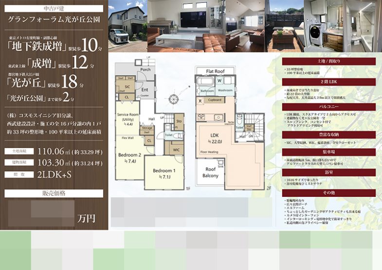 Works 中古一戸建 マイソク(東京都練馬区) 不動産図面制作 2022.05.28 近隣に公園がある物件のため、右側の背景には木の写真を使い、視覚的にイメージしやすいようにしました。 駅徒歩分数と合わせて、公園までの徒歩分数も記載しました。 上部には写真を複数枚使用して、物件の様子がよくわかるようにしました。 ※間取図は他社様作成。 オリジナルマイソク、B4横長、片面 マイソク雰囲気:ナチュラル色:ブラウン・ベージュ << 中古マンション マイソク(東京都足立区) | 一覧に戻る | 投資用1棟アパート マイソク(東京都足立区) >> 関連記事 中古マンション マイソク(神奈川県横浜市神奈川区) 中古一戸建 マイソク(栃木県宇都宮市) 中古マンション マイソク(埼玉県さいたま市浦和区) 土地 マイソク(東京都豊島区)
