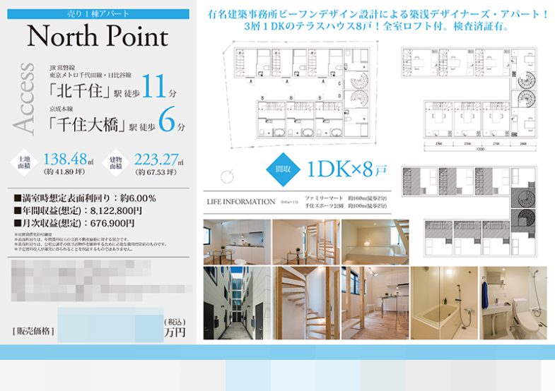 Works 投資用1棟アパート マイソク(東京都足立区) 不動産図面制作 2022.06.07 水色とグレーを基調としたシンプルなデザイン。 写真を複数枚使用することで、物件の様子がよくわかるようにしました。 アクセスが良い物件のため、駅徒歩分数を目立つように記載しています。 左側に物件の情報をまとめることで、見やすく情報を整理しました。 ※間取り図は他社様作成 オリジナルマイソク、B4横長、片面 マイソク雰囲気:シンプル雰囲気:爽やか色:ブルー色:シルバー・グレー << 中古一戸建 マイソク(東京都練馬区) | 一覧に戻る | ナンバーセブン様 webサイト制作 >> 関連記事 投資用1棟ビル マイソク(東京都杉並区) 中古マンション マイソク(東京都北区) 土地 マイソク(東京都中野区) 土地 マイソク(東京都町田市)