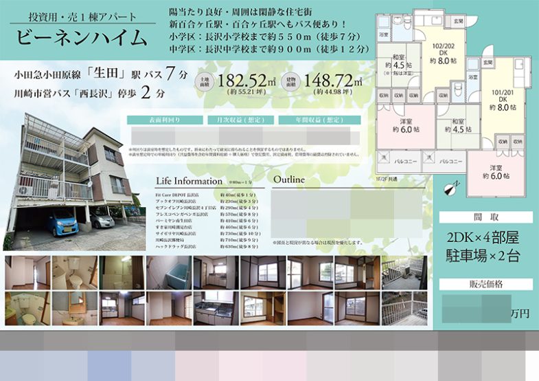 Works 投資用1棟アパート マイソク(神奈川県川崎市多摩区) 不動産図面制作 2022.06.11 エメラルドグリーンを基調とし、背景には木の写真を入れて爽やかな印象のデザインにしました。 また、写真を多く使用することで、視覚的に物件のイメージがしやすいようにしました。 左側には外観の切り抜き写真を掲載して、インパクトを出しました。 間取図は壁をグレーにしてスタイリッシュな印象にし、文字はわかりやすさを重視し、日本語で記載しました。 オリジナルマイソク、B4横長、片面 雰囲気:爽やか雰囲気:ナチュラル色:グリーン間取図 << ナンバーセブン様 webサイト制作 | 一覧に戻る | 売り店舗+住宅 マイソク(東京都八王子市) >> 関連記事 ドゥーエ二子新地 webサイト(スマートフォン向け)制作(株式会社 桜華ハウジング様) 売事務所・工場 マイソク(北海道石狩市) 賃貸マンション マイソク(東京都板橋区) 中古マンション マイソク(埼玉県越谷市)