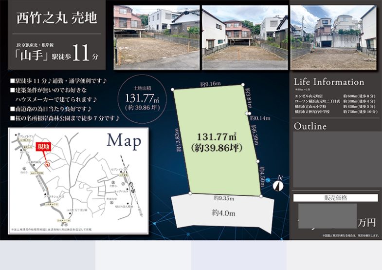 Works 土地 マイソク(神奈川県横浜市中区) 不動産図面制作 2022.08.22 背景に幾何学模様を使ったスタイリッシュなデザイン。 地図と区画図も作成させていただきました。 土地のため区画図を大きめに掲載し、写真は3枚だけ使用しました。 オリジナルマイソク、B4横長、片面 マイソク雰囲気:スタイリッシュ・モダン雰囲気:高級感・シック色:ブルー色:シルバー・グレー区画図地図 << 中古マンション マイソク(東京都八王子市) | 一覧に戻る | 中古マンション マイソク(神奈川県横浜市港北区) >> 関連記事 新築一戸建(建売1棟) マイソク(神奈川県横浜市泉区) 新築一戸建(建売2棟) マイソク(東京都渋谷区) 賃貸アパート マイソク(神奈川県川崎市麻生区) 中古マンション マイソク(東京都台東区)