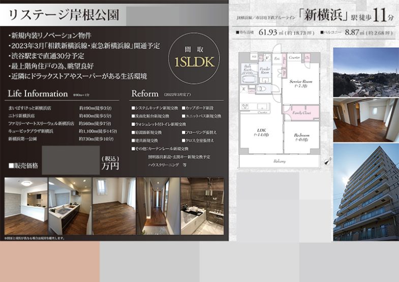 Works 中古マンション マイソク(神奈川県横浜市港北区) 不動産図面制作 2022.08.22 グレーを背景にしたスタイリッシュなデザイン。 右側の背景にはコンクリートのテクスチャを使用しました。 写真を複数枚使用して、物件のイメージが視覚的にわかりやすいように工夫しました。 間取図は、壁をグレーにして、文字を英語にすることで、高級感のある印象を演出しました。 オリジナルマイソク、B4横長、片面 マイソク雰囲気:スタイリッシュ・モダン雰囲気:高級感・シック色:シルバー・グレー間取図 << 土地 マイソク(神奈川県横浜市中区) | 一覧に戻る | 中古マンション マイソク(神奈川県厚木市) >> 関連記事 中古一戸建 マイソク(東京都日野市) 中古マンション マイソク(神奈川県横浜市戸塚区) 中古マンション マイソク(神奈川県横浜市保土ケ谷区) 貸店舗・事務所 マイソク(東京都目黒区)