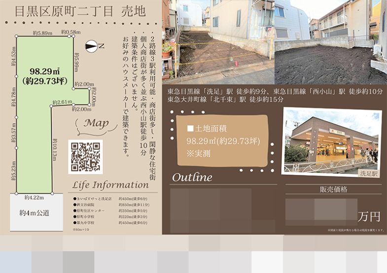Works 土地 マイソク(東京都目黒区) 不動産図面制作 2022.09.01 茶色を基調としたおしゃれなデザイン。 最寄り駅の写真も掲載することで、アクセスの良い物件であることを印象付けました。 地図はQRコードにすることで、スマホですぐにグーグルマップを確認できるようにしました。 区画図も作成させていただきました。 オリジナルマイソク、B4横長、片面 マイソク雰囲気:かわいい色:ブラウン・ベージュ区画図地図QRコード << 中古一戸建 マイソク(神奈川県横浜市磯子区) | 一覧に戻る | 新築一戸建(建売2棟) マイソク(東京都荒川区) >> 関連記事 新築一戸建(建売1棟) マイソク(東京都調布市) 中古一戸建 チラシ(東京都町田市) 中古一戸建 マイソク(神奈川県三浦郡葉山町) 中古マンション マイソク(東京都杉並区)
