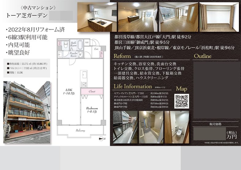 Works 中古マンション マイソク(東京都港区) 不動産図面制作 2022.09.08 白と黒を基調とした高級感のあるデザイン。 地図はQRコードにして、スマホでGooglemapが立ち上がるようにしました。 間取図は壁をグレーにして、文字を英語にすることで、スタイリッシュな印象にしました。 写真を複数枚使用することで、物件のイメージがしやすくなるように工夫しました。 オリジナルマイソク、B4横長、片面 マイソク雰囲気:高級感・シック色:ブラック色:ゴールド色:シルバー・グレー間取図地図QRコード << 賃貸マンション マイソク(東京都港区) | 一覧に戻る | 中古マンション マイソク(東京都港区) >> 関連記事 投資用区分マンション マイソク(東京都練馬区) 中古マンション マイソク(東京都八王子市) 土地 マイソク(東京都世田谷区) 中古マンション マイソク(神奈川県鎌倉市)