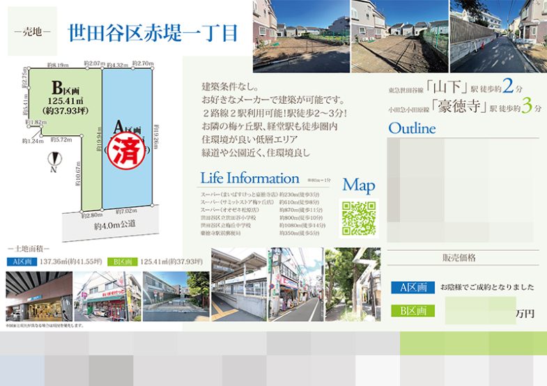 Works 土地 マイソク(東京都世田谷区) 不動産図面制作 2022.09.15 青と緑を使ったスタイリッシュなデザイン。 区画図の色も青と緑に分けて、わかりやすくしました。 周辺施設の写真を掲載し、利便性の良さが伝わるように工夫しています。 地図はQRコードにし、スマホですぐに現地周辺地図が確認できるようにしました。 オリジナルマイソク、B4横長、片面 マイソク雰囲気:スタイリッシュ・モダン雰囲気:爽やか色:ブルー色:グリーン区画図地図QRコード << 土地 マイソク(東京都世田谷区) | 一覧に戻る | 中古マンション マイソク(北海道札幌市中央区) >> 関連記事 サンクレメンテ駒沢 webサイト制作(株式会社 リテラス様) 中古マンション マイソク(神奈川県横浜市南区) 中古マンション マイソク(神奈川県横浜市都筑区) 土地 マイソク(大阪府大阪市西淀川区)