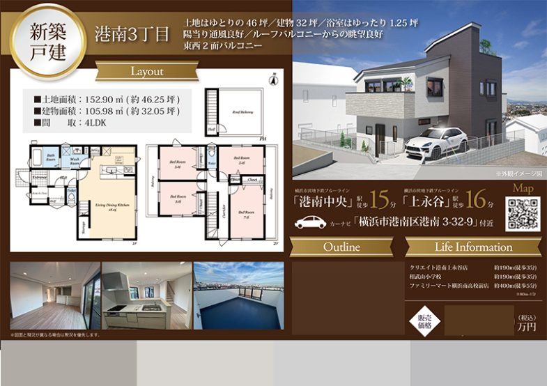 Works 新築一戸建(建売1棟) マイソク(神奈川県横浜市港南区) 不動産図面制作 2022.09.20 茶色を基調とした重厚感のあるデザイン。 地図はQRコードにすることで、スマホですぐにGoogle Mapを確認できるようにしました。 外観パースを右上に大きく配置して、インパクトを出しました。 オリジナルマイソク、B4横長、片面 マイソク雰囲気:高級感・シック色:ブラウン・ベージュ色:ゴールド間取図地図QRコード << 中古マンション マイソク(東京都港区) | 一覧に戻る | 中古マンション マイソク(埼玉県草加市) >> 関連記事 中古マンション マイソク(東京都江東区) 不動産売却物件募集チラシ 新築一戸建(建売1棟) マイソク(神奈川県横浜市中区) THE TOKYO TOWERS MID TOWER webサイト制作(株式会社 ラピス様)