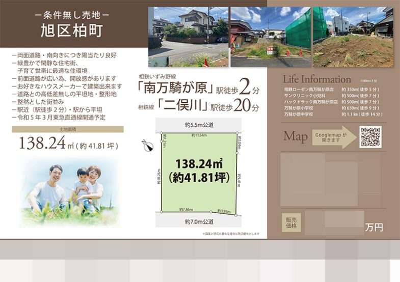Works 土地 マイソク(神奈川県横浜市旭区) 不動産図面制作 2022.09.22 茶色を基調としたシンプルなデザイン。 家族のイメージ写真を入れて、デザインのアクセントにしました。 地図はQRコードを掲載し、スマホですぐにグーグルマップを確認できるようにしました。 区画図も作成させていただきました。 オリジナルマイソク、B4横長、片面 マイソク雰囲気:シンプル雰囲気:ナチュラル色:ブラウン・ベージュ区画図地図QRコード << 中古マンション マイソク(埼玉県草加市) | 一覧に戻る | 投資用1棟アパート マイソク(神奈川県横浜市港北区) >> 関連記事 パストラルガーデン webサイト制作(株式会社 リテラス様) ノートデザイン(ガールズバンドステージコンテスト様) 賃貸マンション マイソク(東京都千代田区) 中古マンション マイソク(東京都千代田区)