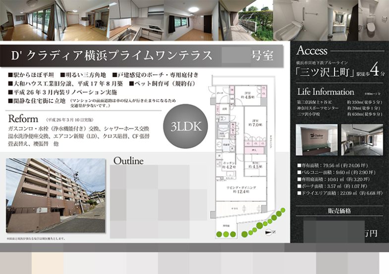 Works 中古マンション マイソク(神奈川県横浜市神奈川区) 不動産図面制作 2022.09.12 黒を基調としたスタイリッシュなデザイン。 間取図も文字を英語にすることでスタイリッシュな印象にしました。 外観写真を左下に配置し、デザインのアクセントにしました。 多くの写真を使用することで、物件の様子がよくわかるようにしました。 売りの一つである駅徒歩分数は大きめに記載して目立たせてます。 オリジナルマイソク、B4横長、片面 マイソク雰囲気:スタイリッシュ・モダン色:ブラック色:シルバー・グレー間取図 << 中古マンション マイソク(神奈川県川崎市幸区) | 一覧に戻る | 中古一戸建 マイソク(神奈川県横浜市南区) >> 関連記事 ペルシャ絨毯の光和様 webサイト制作 東京バイクガレージ webサイト制作(株式会社 Fine office様) 中古一戸建 マイソク(神奈川県横浜市泉区) 土地 マイソク(神奈川県横浜市旭区)