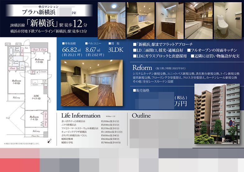 Works 中古マンション マイソク(神奈川県横浜市港北区) 不動産図面制作 2022.10.17 青と紺を基調とした高級感のあるデザイン。 間取図は壁をグレーにして、文字を英語にすることでスタイリッシュな印象にしました。 写真を多数使用して、視覚的にわかりやすいマイソクを目指しました。 売りの一つである駅徒歩分数は左上に大きめに記載して目立たせています。 オリジナルマイソク、B4横長、片面 マイソク雰囲気:高級感・シック色:ブルー色:シルバー・グレー間取図 << 投資用1棟アパート マイソク(神奈川県川崎市多摩区) | 一覧に戻る | 中古一戸建 マイソク(東京都江戸川区) >> 関連記事 中古マンション マイソク(東京都足立区) 新築一戸建(建売2棟) マイソク(東京都荒川区) 土地 マイソク(神奈川県横浜市青葉区) 新築一戸建(建売1棟) マイソク(東京都江戸川区)