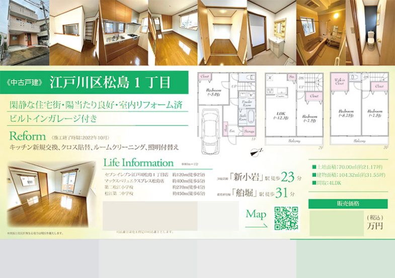 Works 中古一戸建 マイソク(東京都江戸川区) 不動産図面制作 2022.10.18 緑を基調とした温かみのあるデザイン。 地図はQRコードにすることで、スマホですぐにGoogleマップを確認できるようにしました。 上部に写真を多めに配置して、インパクトを出すとともに、物件の様子がよくわかるようにしました。 オリジナルマイソク、B4横長、片面 マイソク雰囲気:爽やか色:イエロー・オレンジ色:グリーン間取図地図QRコード << 中古マンション マイソク(神奈川県横浜市港北区) | 一覧に戻る | 投資用1棟マンション マイソク(東京都港区) >> 関連記事 新築一戸建(建売1棟) マイソク(東京都世田谷区) 土地 マイソク(東京都文京区) ガールズバンドステージコンテスト様 webサイト制作 土地 マイソク(東京都大田区)
