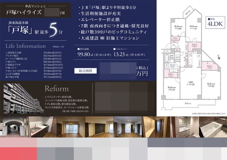 Works 中古マンション マイソク(神奈川県横浜市戸塚区) 不動産図面制作 2023.01.09 紺と濃いグレーを基調とした高級感のあるデザイン。 間取図も壁をグレーにし、文字を英語にすることで、高級感のある印象を引き立たせました。 左下に外観写真の切り抜きを入れることで、デザインのアクセントにしました。 視覚的にわかりやすいように、写真を多めに使用しました。 オリジナルマイソク、B4横長、片面 マイソク雰囲気:高級感・シック色:ブルー色:シルバー・グレー間取図 << 中古一戸建 マイソク(神奈川県藤沢市) | 一覧に戻る | 中古一戸建 マイソク(東京都豊島区) >> 関連記事 中古マンション マイソク(神奈川県横浜市中区) 土地 マイソク(東京都葛飾区) 新築一戸建(建売1棟) マイソク(東京都八王子市) リーベ高田馬場 webサイト制作(株式会社 リテラス様)