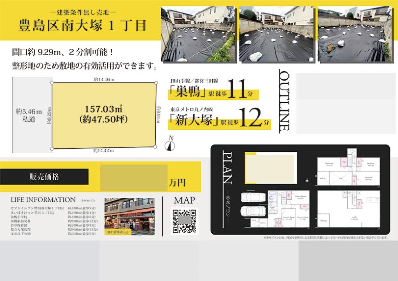 土地は現地の場所がわかりにくいため、GooglemapのQRコードを入れて、正確に現地の場所がわかるようにしました。